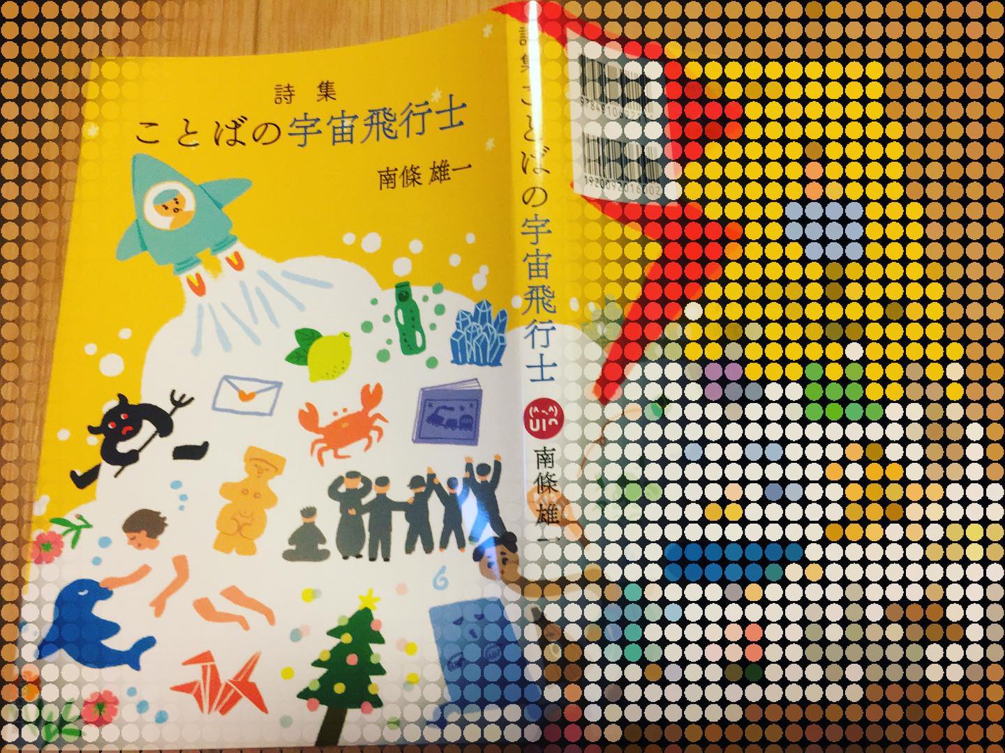 詩集『ことばの宇宙飛行士』のカバーは、見開きで一枚の絵。是非、広げて全体像をお楽しみ頂きたい。